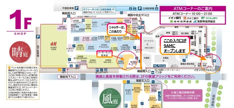 バーガーキングが出店する専門店が出店しているエリアは、10AMにシャッターが開きますが、バーガーキング松本店が出店するすぐ横のエリアはイオンスタイル(スーパー)で、イオンスタイルエリアは9AMオープンです。なので、実質バーガーキング店舗前で並ぶ事ができるのです。多分大勢が同じ考えをして並ぶでしょうねー。