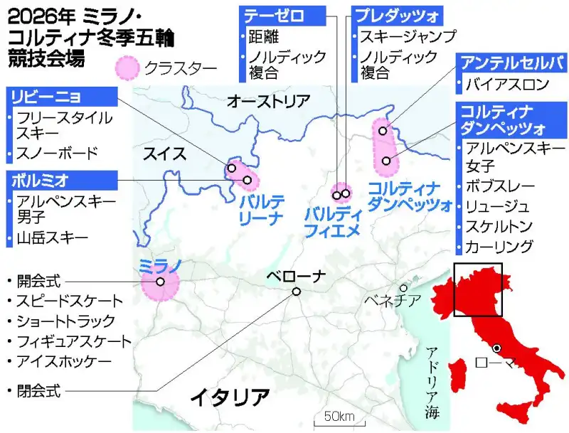 開会式はミラノ、閉会式はコルティナ・ダンペッツォで行われ、競技は北イタリア各地の会場に分かれて実施される予定です。