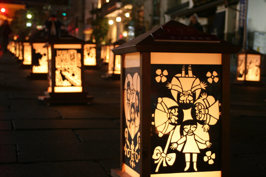 長野灯明まつりでは、市民が制作した灯りの展示が街の各所に並びます。地域の温かさを感じられる展示が多く、光のアートを見ながら街歩きを楽しめるのが魅力です。善光寺周辺だけでなく表参道にも展示が点在しているため、散策コースとしても充実しています。個性的な作品が多く、見るたびに発見のある企画です。