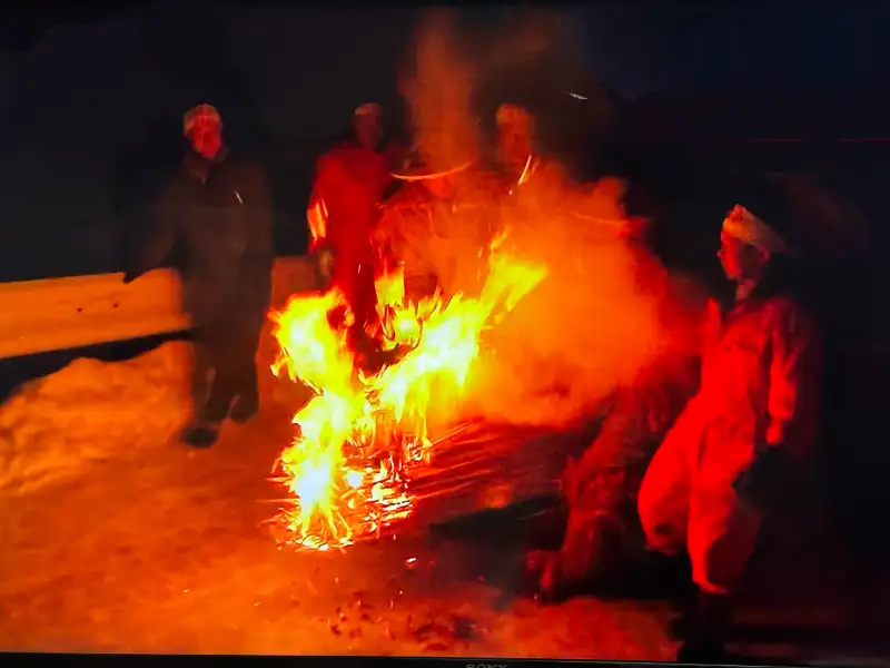 道祖神祭りのクライマックスは、厳しい寒さに包まれた夜、社殿に炎が迫る瞬間に訪れます。深く積もった雪が音を吸い込む静寂の中で、松明の火が揺れ動き、やがて一気に燃え広がる光景は、見る者の感覚を強く揺さぶります。白一色だった景色が赤く染まり、闇と雪、炎がせめぎ合うその場には、言葉では表しきれない緊張感が漂います。