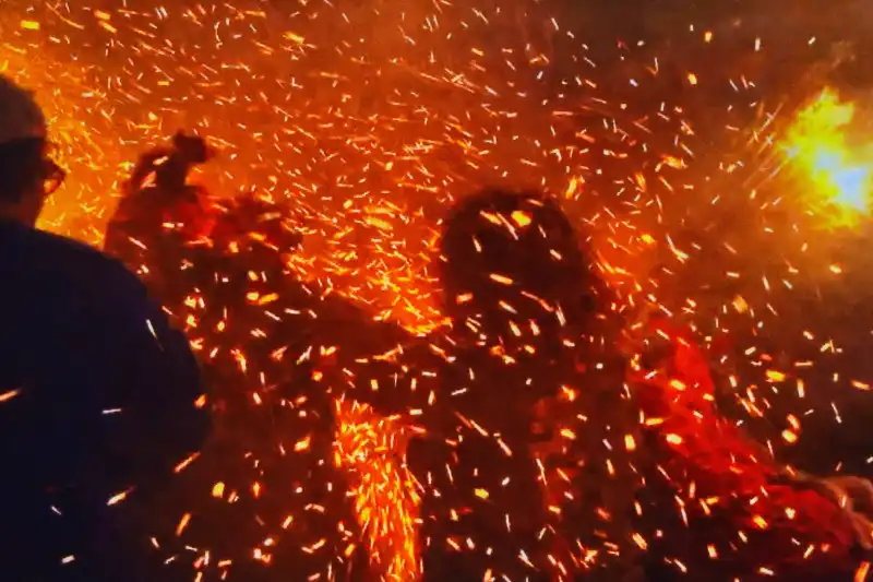 1時間後、巨大な松明に火がつけられ、男達が謳いながら、燃える松明をおよそ300m離れた祭り会場まで運びます。