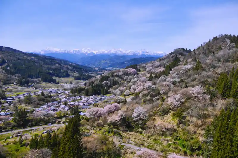 その小川村には、オオヤマザクラとヤマザクラが、周辺一帯約8ヘクタールに植わる桜の名所で、約7,000本もの桜が咲き誇ります。村民が大切に管理し、里谷の春を彩っています。
