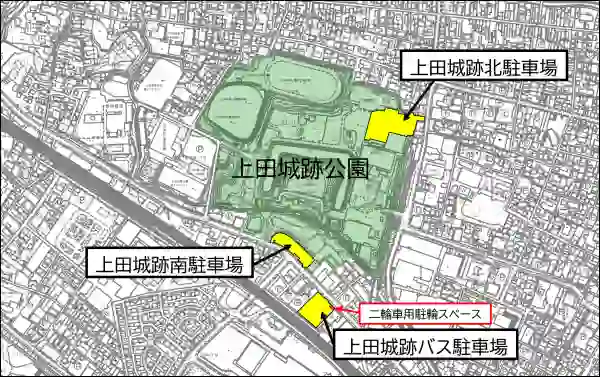 バイクは、「上田城跡バス駐車場」の場内にある二輪車用駐車スペース(無料)が利用出来ます。