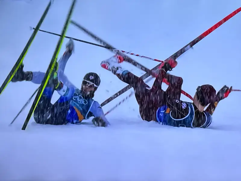 湿った重い雪が降りしきる中で進んだレース。後半のクロスカントリーでは、山本涼太さんはトップと7秒差まで縮める力走を見せ、続く渡部暁斗さんがさらに1秒差まで追い上げます。しかし、山本さんは、7周目の時ドイツのガイガー選手の転倒に巻き込まれるアクシデントに巻き込まれ、惜しくも6位入賞となりました。